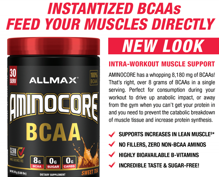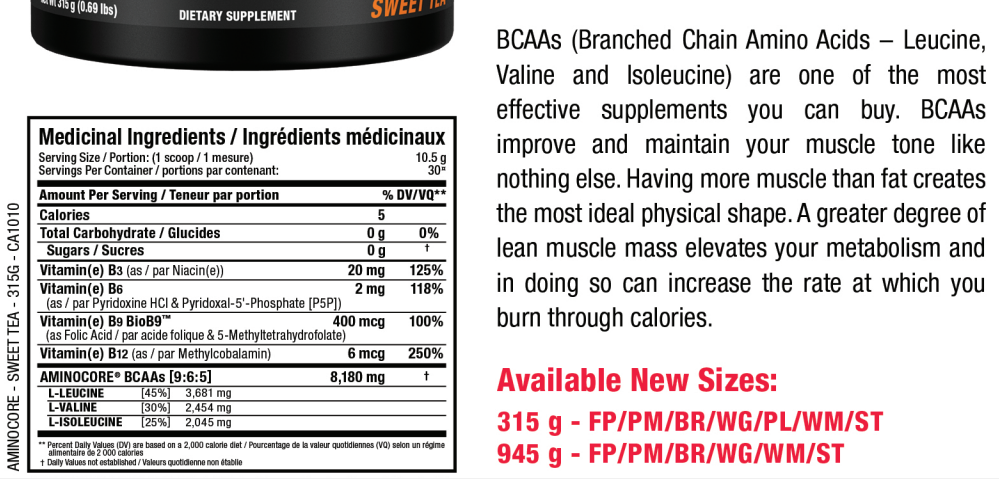 AMINOCORE delivers 8.18g of BCAA in a 9:6:5 ratio clinically proven to provide a 350% increase in activation of muscle growth signals! The purest, free-form source of BCAA with a great taste! Aminocore is proven to increase lean muscle mass and contains highly bioavailable B vitamins to support energy and absorption.